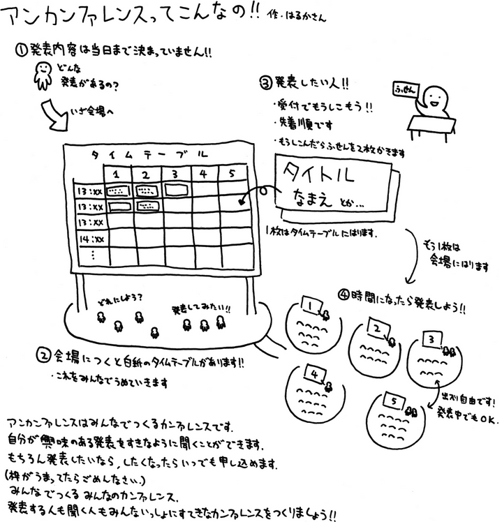 事前に発表者や講演内容が決まっておらず、当日参加した人が自分の話したい内容を発表する、参加者全員でつくりあげるカンファレンスです。