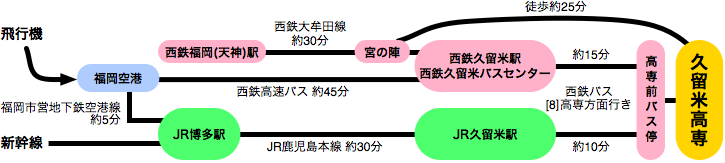 - 西鉄福岡(天神)駅 → 西鉄大牟田線 約30分 → 西鉄久留米駅 → 西鉄バス 行き先番号8番 高専方面行き 約15分