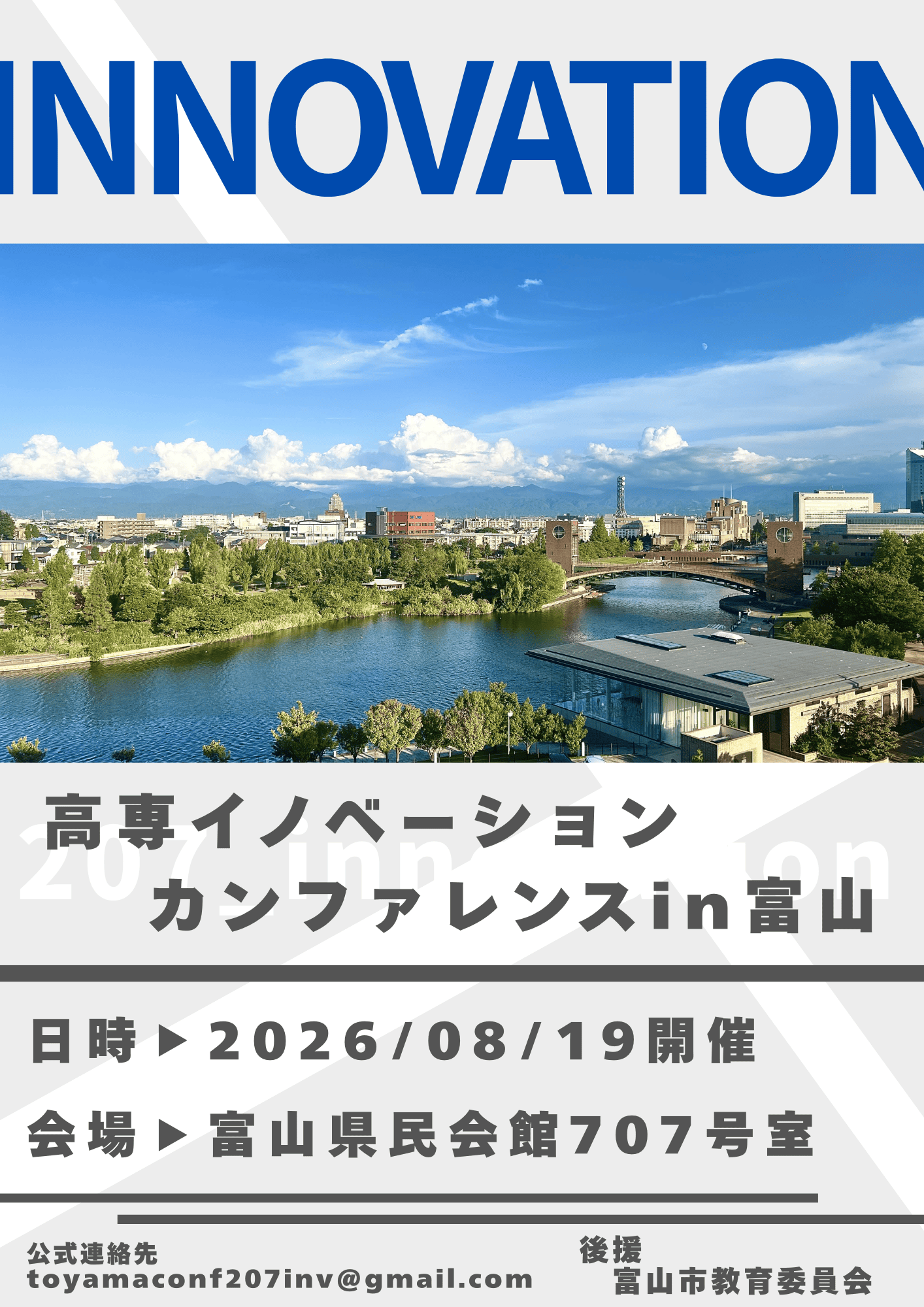 技術革新を意味する「イノベーション」をテーマとし、本会ではこれを身近な生活に根ざした工夫や発想のプロセスとして捉え、高専生ならではの登壇を通して誰もが気軽に触れられる"イノベーションへの入口"とすることを目指します。