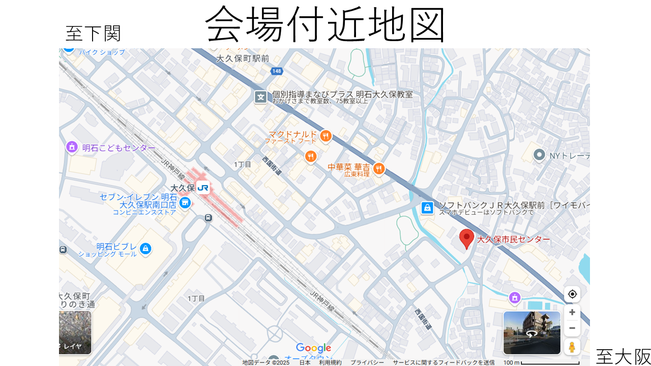 会場最寄り駅はJR西日本山陽本線「大久保駅(兵庫県)」です。