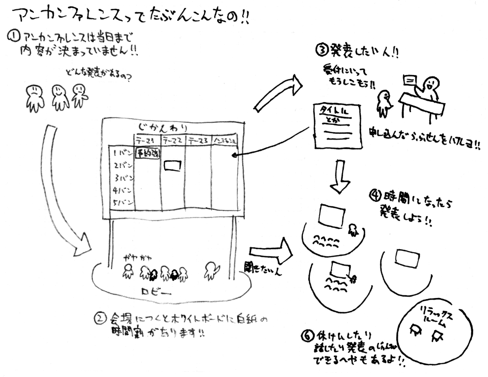 事前に発表者や講演内容が決まっておらず、当日参加した人が自分の話したい内容を発表する、参加者全員でつくりあげるカンファレンスです。