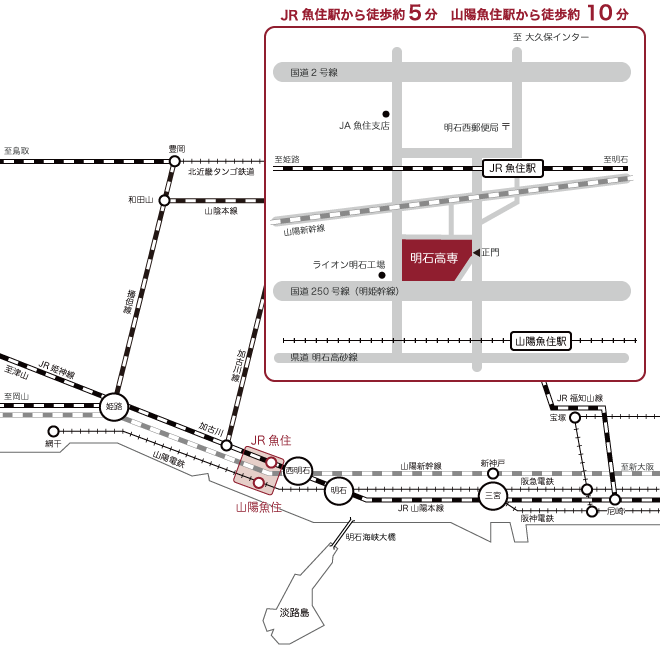 - 山陽電鉄の場合、山陽魚住駅には、特急は止まりません。特急の場合、三宮方面からお越しの方は山陽明石駅、姫路方面からお越しの方は東二見駅でお乗り換え下さい。