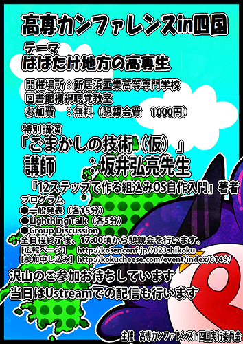 - 運営に参加したい!という方は、shikoku[at]kosenconf.jp([at]を @ に変更してください)にご連絡ください。