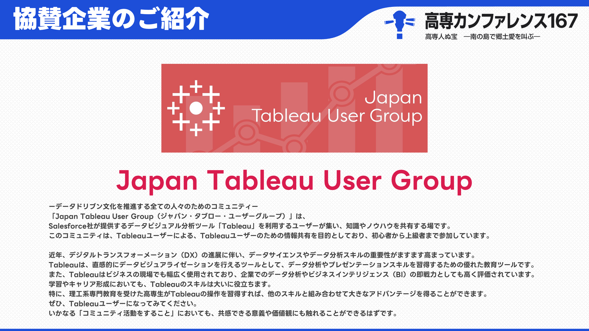 | 14:10 | Japan Tableau User Group 髙栁 雅弘様 | 企業 | 高専生、Tableauを使え! -コミュニティ活動をするということ- |