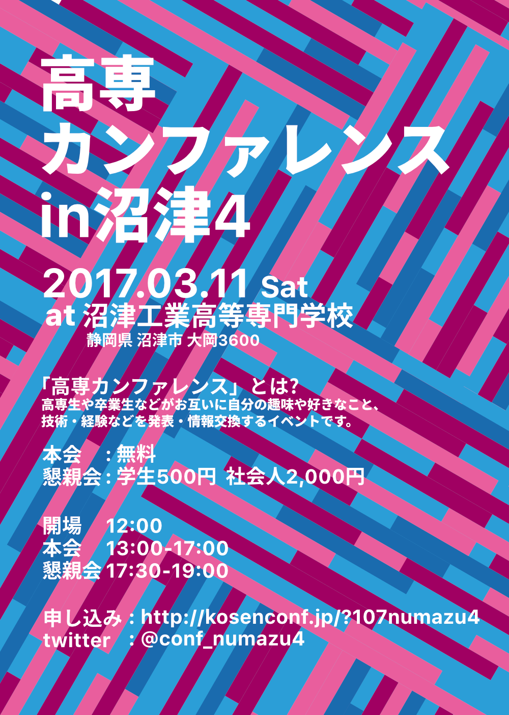- kosenconfnumazu4[at]gmail.com ([at]を@に変更してください)